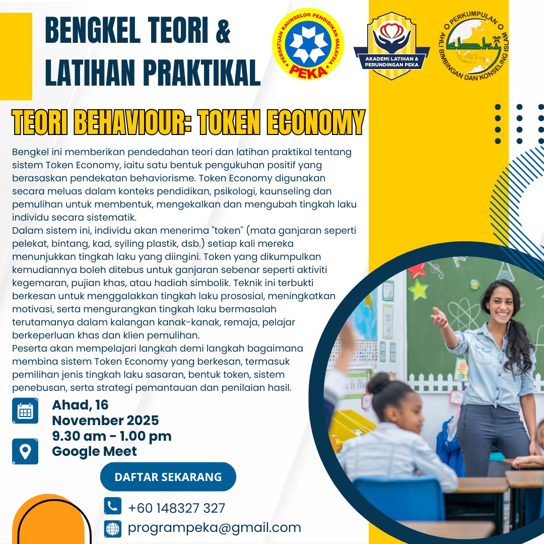 Bengkel intensif ini memberi pendedahan teori dan latihan hands-on tentang sistem Token Economy—strategi pengukuhan positif berasaskan behaviorisme yang terbukti membantu membentuk, mengekalkan dan mengubah tingkah laku secara sistematik. Sesuai untuk konteks pendidikan, psikologi, kaunseling dan pemulihan (kanak-kanak, remaja, pelajar berkeperluan khas, serta intervensi tingkah laku di rumah/sekolah).